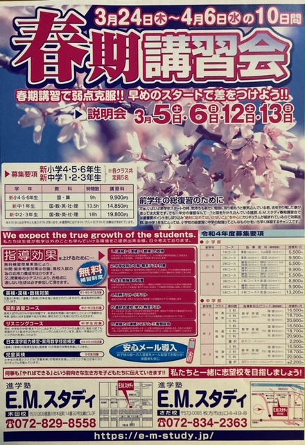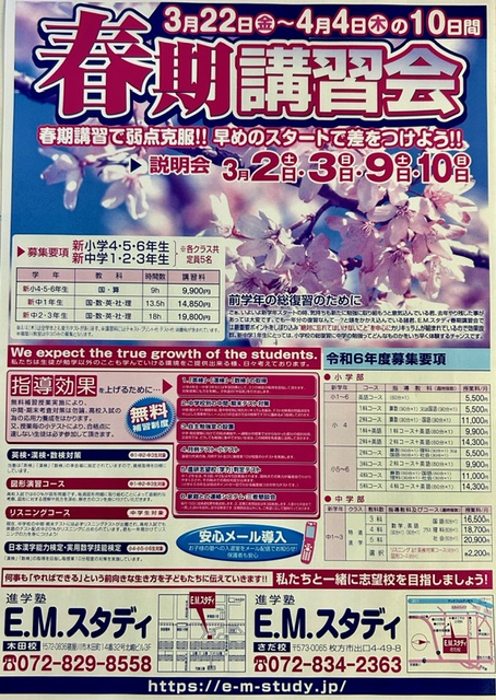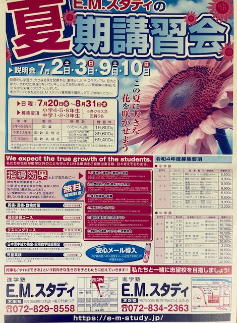 補習制度が充実 進学塾 E.M.スタディでは、部活動の急な練習や試合、体調不良や忌引きなど、欠席の理由によって、無料補習授業を実施しています。振替日を相談させていただき、勉強の遅れがないように、サポートいたします。詳しく見る